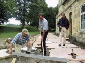 Innenausbau bis zu einem Weg, gelegt aus großen Sandsteinplatten,